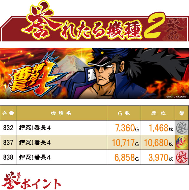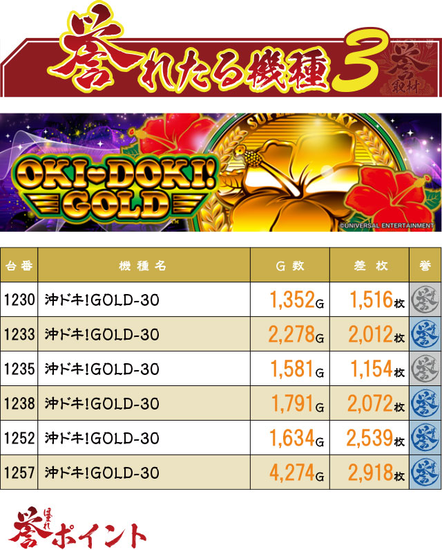 プラス差枚が続出したのは『沖ドキ!GOLD-30』。パチスロコーナー最大設置機種だけあって、誉マークの数も多かった。次回は赤誉マークに期待!