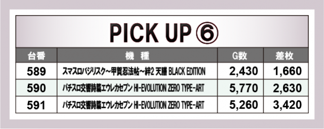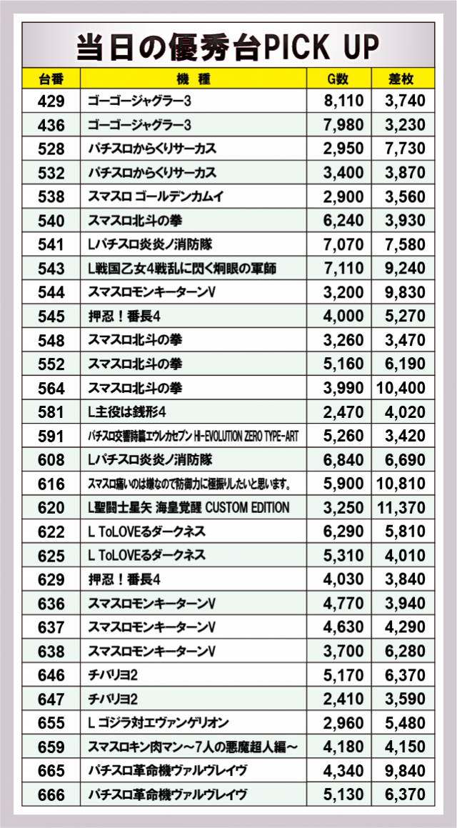 優秀台に目を通してみると、『L聖闘士星矢 海皇覚醒 CUSTOM EDITION』620番台+11,370枚、『スマスロ痛いのは嫌なので防御力に極振りしたいと思います。』616番台+10,810枚、『スマスロ北斗の拳』564番台+10,400枚と3台の万枚OVERが存在していた。そのほか、スマスロ人気機種が中心となって盛り上がりを形成しており、各所でファンが笑顔を浮かべる光景が広がっていた。
