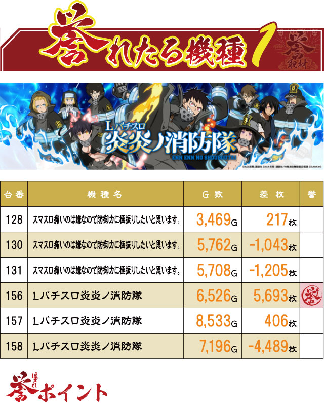 ともに同じ3台設置の『スマスロ痛いのは嫌なので防御力に極振りしたいと思います。』と『Lパチスロ炎炎ノ消防隊』。しかしその結果は全く異なるものに。前者は特に見せ場もなく終わってしまったが、後者は156番台が奮起し、+5,500枚オーバーを達成した。