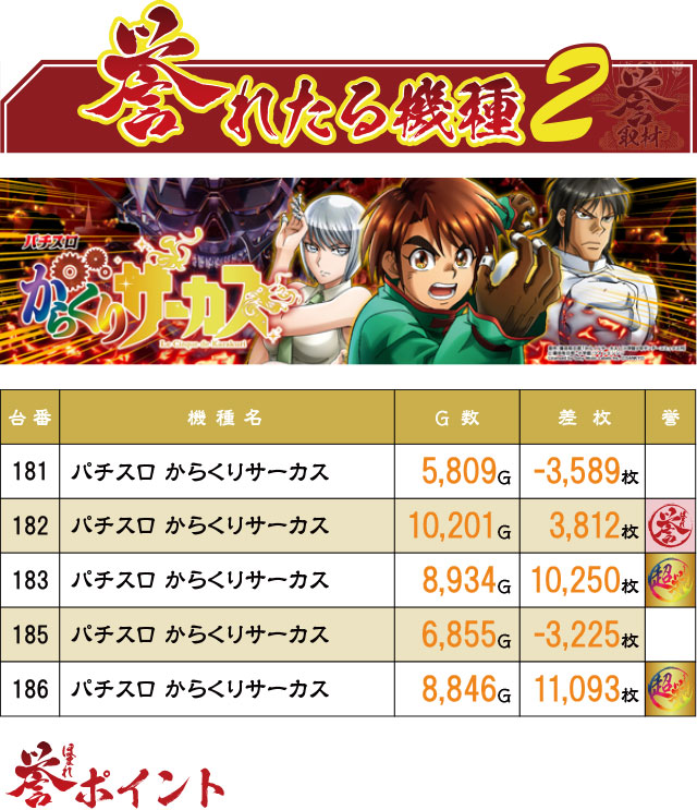 5台設置の『パチスロ からくりサーカス』は、かなり好調だった様子。3台がプラスだったが、その3台ともに誉マーキングが…!しかも内2台は+10,000枚超えというにわかには信じられない結果に。この結果はマグレではなく、優秀台が持ち前のポテンシャルを発揮したということで間違いなさそうだ。