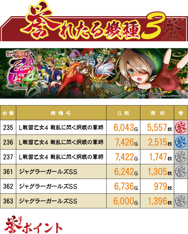 『L戦国乙女4 戦乱に閃く炯眼の軍師』と『ジャグラーガールズSS』も3台並びでかなりの盛り上がりを見せてくれた。ともに当たり前のように3台並んでプラっていた上、6台中5台に誉マーキングが…!