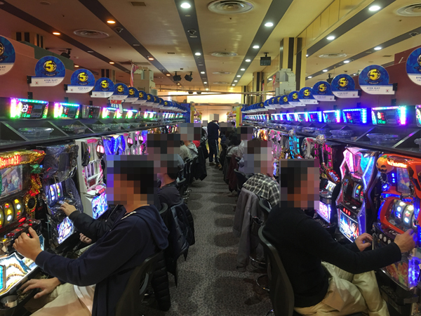 バラエティ構成の5円パチスロにおいても活躍するプレイヤーが多数。笑顔のプレイヤーが多く、シマ全体が明るい雰囲気となっていた。