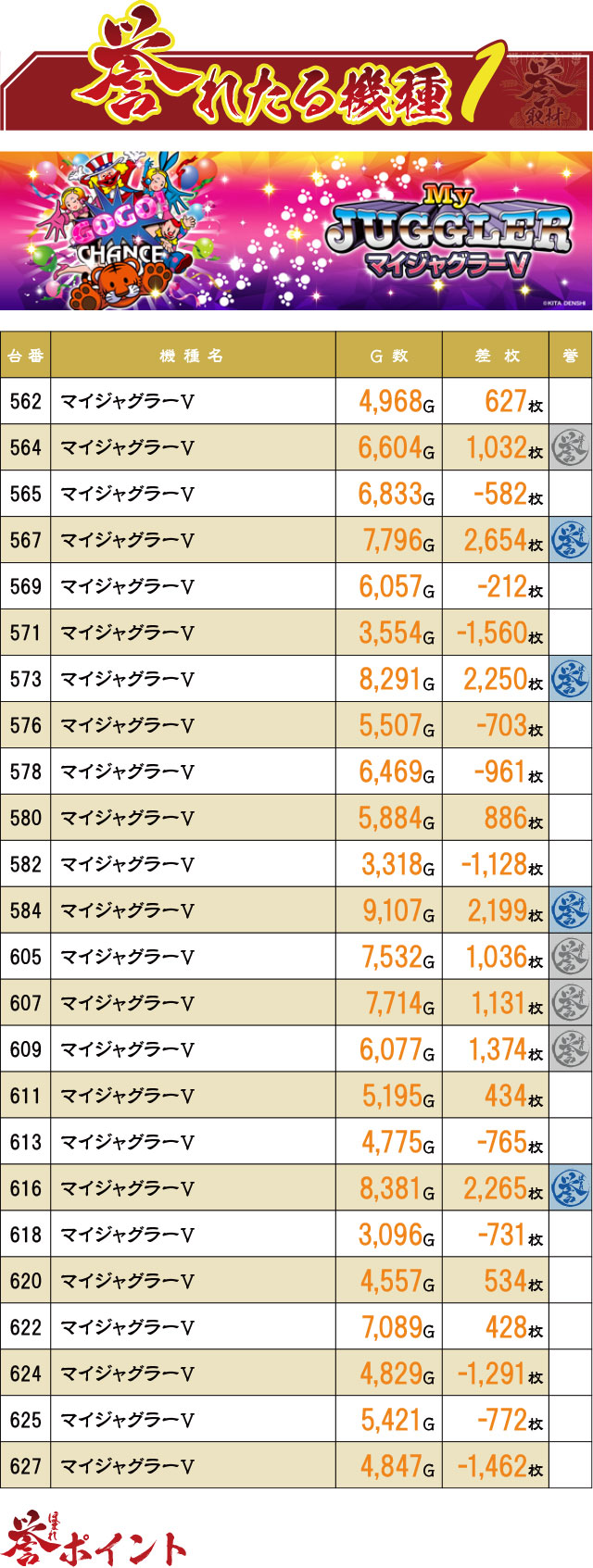 この日、多くのプラス台を生み出したのは、全40台設置の『マイジャグラーⅤ』。さすが常連さん人気の高い台だけあって、相当数の優秀台が潜んでいたと見て間違いなさそうだ。