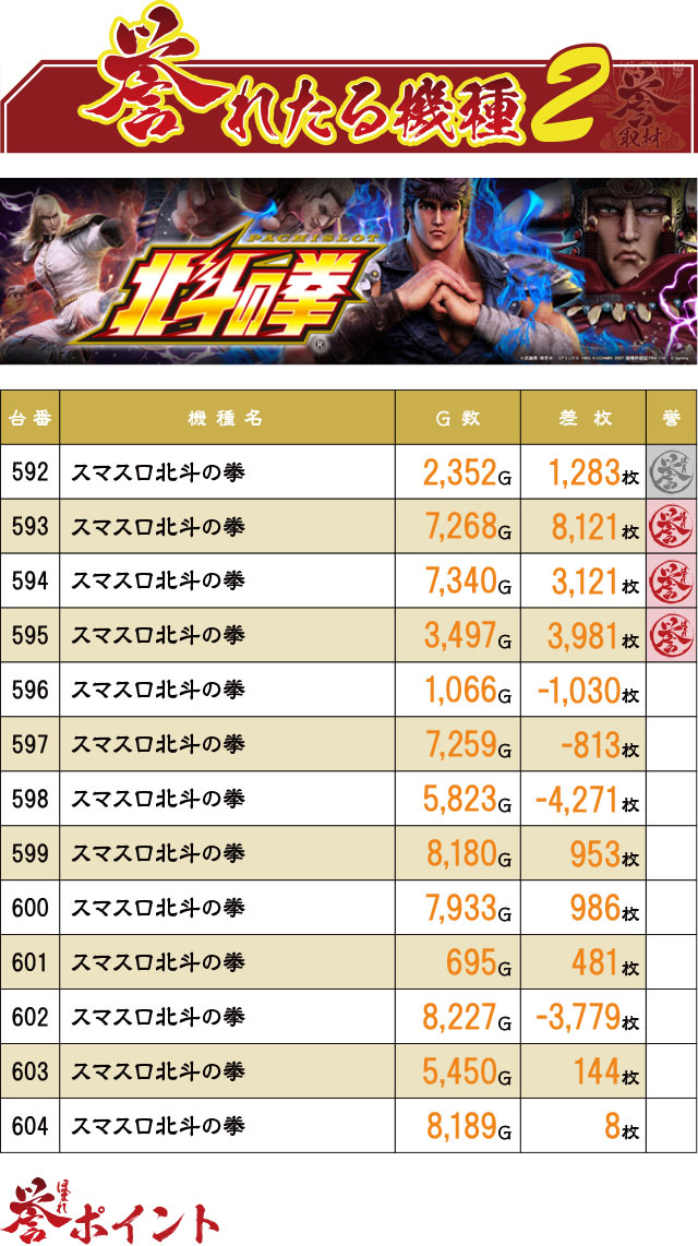 全13台設置の『スマスロ北斗の拳』のトータル差枚はプラスに。593番台から8,000枚オーバー台が出現するなど、挙動の良好な台が多く、全台にチャンスが潜んでいた可能性も…!