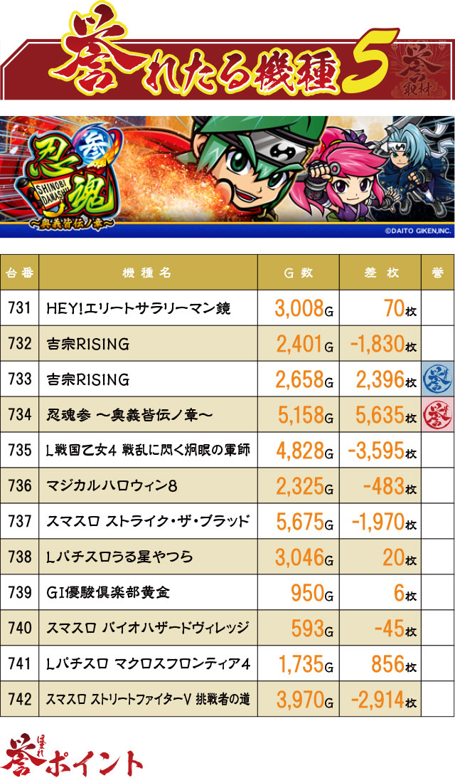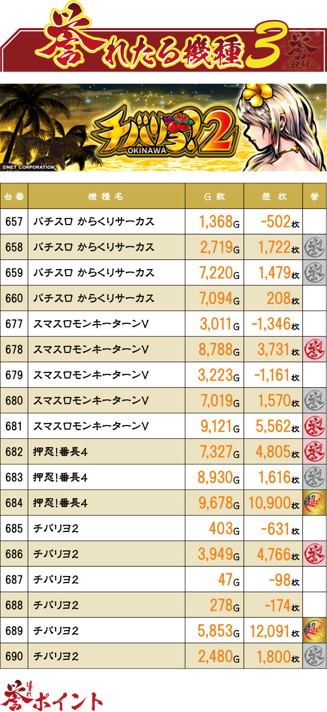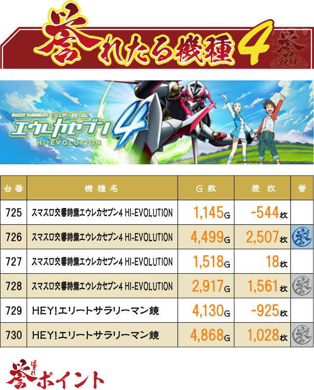 『スマスロ交響詩篇エウレカセブン4 HI-EVOLUTION』と『HEY!エリートサラリーマン鏡』が6台連なるこちらは、半数の3台に誉マークが。しかし総ゲーム数が5,000Gを超えている台が1台もなく、もっと回されていたら全く違う結果になっていたかも。
