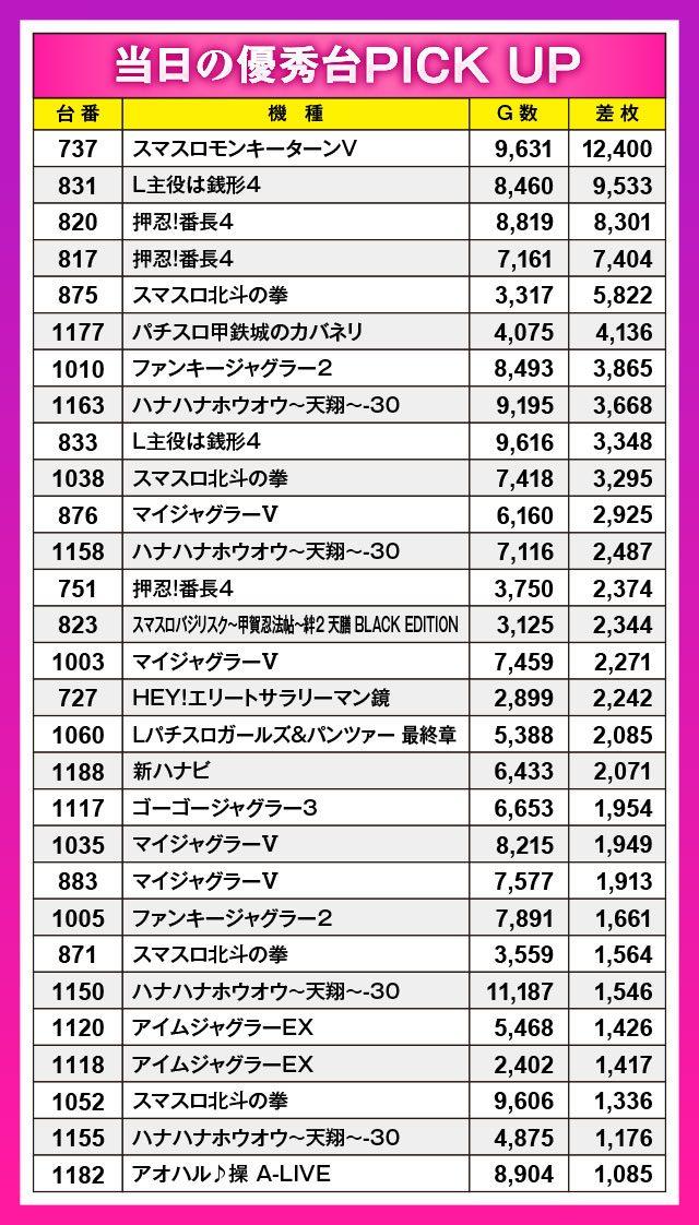 この日の首位レコードに輝いたのは、+12,000枚オーバーの偉業を達成した『スマスロモンキーターンV』。2位にランクインした『L主役は銭形4』も10,000枚に迫る好結果を見せてくれた。3位・4位には『押忍!番長4』が連続ランクイン!