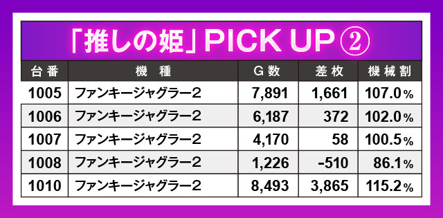 5台設置の『ファンキージャグラー2』の勝率は8割(4/5台)。1010番台が優秀台ムーブを見せ、4,000枚近い結果でフィニッシュ!この高いプラス率は全台が優秀台だったからなのか…。