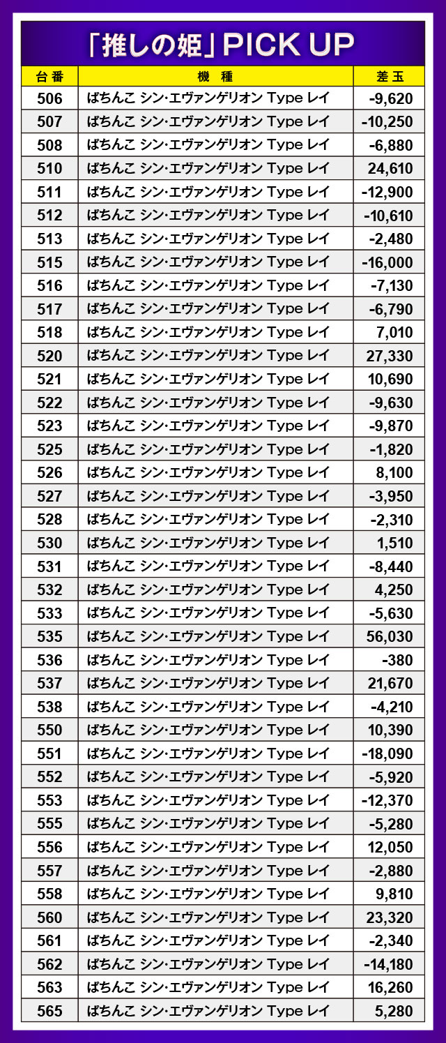 この日も賑わいを見せていた『ぱちんこ シン・エヴァンゲリオン Type レイ』コーナー。+10,000玉を超える結果が生まれていたのはいつも通りだが、この日は535番台から+56,030玉というモンスターレコードが誕生した。これだけ当たったらどれだけ楽しいことか…!
