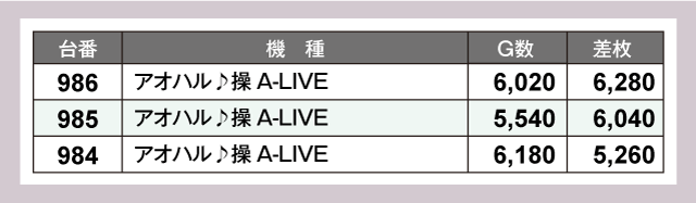 パチスロコーナーで目を引いたのが全台系の3機種。なかでも『アオハル♪操 A-LIVE』が活況で、平均+5,860枚と驚愕の記録を残している。