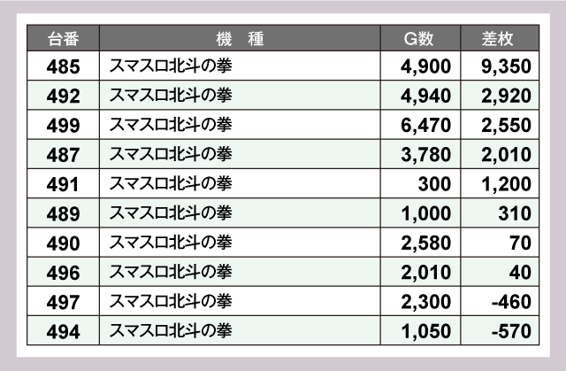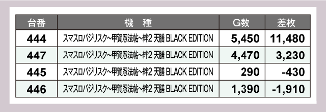 圧巻だったのはパチスロコーナーの『スマスロバジリスク~甲賀忍法帖~絆2 天膳 BLACK EDITION』。444番台が+11,480枚とポテンシャルを最大限に発揮していた。『スマスロ北斗の拳』485番台も+9,350枚と、あと一歩で万枚の素晴らしい結果となっている。