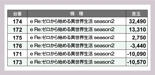 パチンココーナーで好調だったのは『e Re:ゼロから始める異世界生活 season2』。174番台が+32,490発と爽快な差玉を叩き出した。