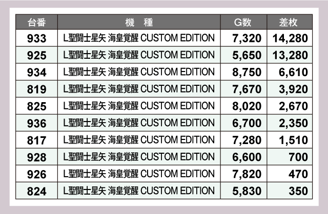 圧巻だったのはパチスロコーナーの『L聖闘士星矢 海皇覚醒 CUSTOM EDITION』。933番台が+14,280枚、925番台が+13,280枚と、万枚超えが2台出現する好結果となっている。