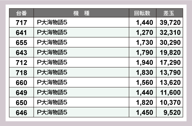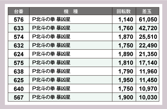 パチンココーナーでは『P北斗の拳 暴凶星』が大暴れ。576番台が+61,050発と驚愕の差玉を叩き出していた。