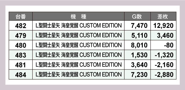 圧巻だったのはパチスロコーナー。『チバリヨ2』630番台が+18,480枚、『L聖闘士星矢 海皇覚醒 CUSTOM EDITION』482番台が+12,920枚と、万枚達成台が2台も誕生している。