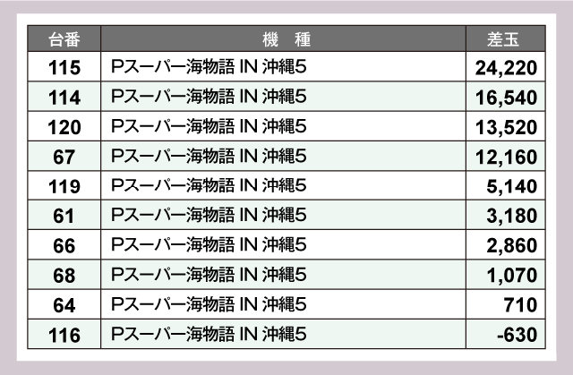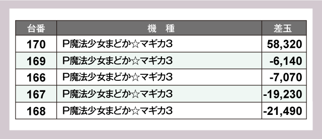 パチンココーナーでは『P魔法少女まどか☆マギカ3』が奮闘。170番台が+58,320発と最高の結果を残した。