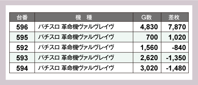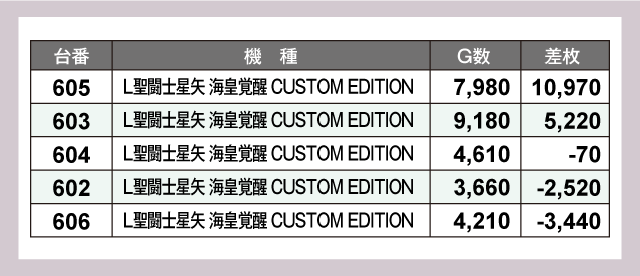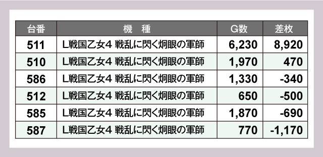 圧巻だったのはパチスロコーナーの『L聖闘士星矢 海皇覚醒 CUSTOM EDITION』。605番台が+10,970枚という衝撃の差枚を叩きだした。続いて『L戦国乙女4 戦乱に閃く炯眼の軍師』511番台が+8,920枚。『パチスロ 革命機ヴァルヴレイヴ』596番台が+7,870枚と、大満足の結果を残している。
