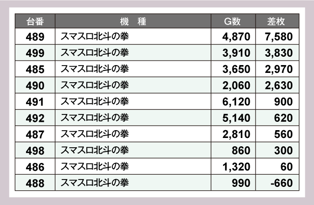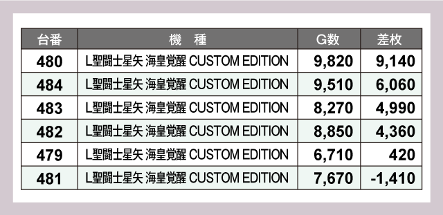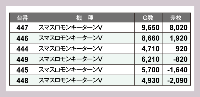 パチスロでは『L聖闘士星矢 海皇覚醒 CUSTOM EDITION』480番台が+9,140枚、『スマスロモンキーターンV』447番台が+8,020枚と、大勝利を収めていた。