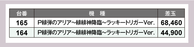 パチンコで圧巻だったのは『P緋弾のアリア~緋緋神降臨~ラッキートリガーVer.』。165番台が+68,460発、164番台が+44,900発と素晴らしい結果を残している。