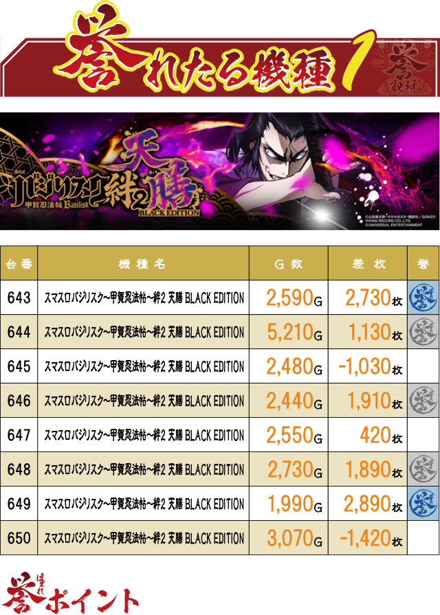 8台設置の『スマスロバジリスク~甲賀忍法帖~絆2 天膳 BLACK EDITION』は、6台がプラスという良好な環境。さらに5台に誉マークが付くなど、優秀台が相当数ひそんでいたのは間違いなさそう。もしや全台系…!?
