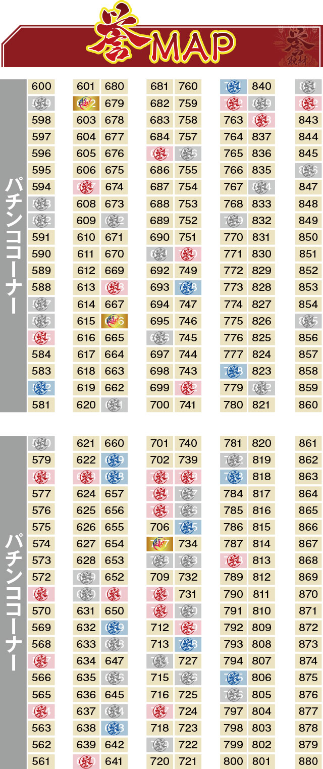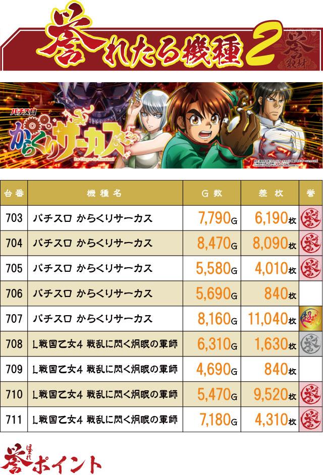 『パチスロ からくりサーカス』と『L戦国乙女4 戦乱に閃く炯眼の軍師』が連なるこちらのブロックから誉マークが続出!赤誉マークだらけの理想的な状況となった。さらに707番台が+11,000枚オーバー!