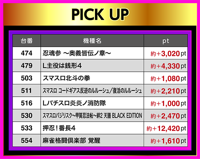 約12,000pt超となった台があったり、幅広い機種に優秀台があったりと、魅力的な要素が盛りだくさん!!