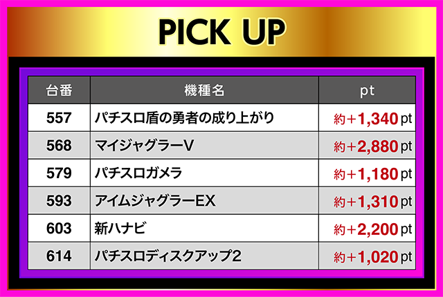 ほかにも、『パチスロ盾の勇者の成り上がり』の557番台や『アイムジャグラーEX』の593番台など、複数台が1,000ptを上回った。