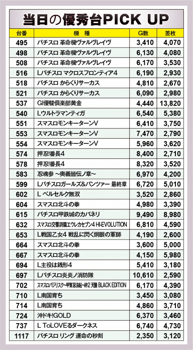 『GI優駿倶楽部黄金』537番台+13,820枚や『Lパチスロ炎炎ノ消防隊』697番台10,610Gなど、この日も当然のように万枚&万回転OVERが発生。『パチスロ甲鉄城のカバネリ』615番台9,490G・+8,980枚が代表するように、綺麗な右肩上がりのグラフを描く台が多く、ファンは打ちごたえのある状況に満足していたことだろう。同時に、高い活気と熱気を維持し続ける同店の実力が窺える内容でもある。