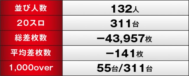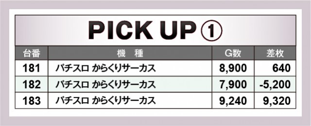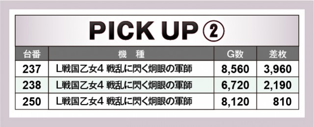 『パチスロ からくりサーカス』181~183番台、『L戦国乙女4 戦乱に閃く炯眼の軍師』237~250番台と、両人気機種では好況スポットが形成されていたようだ。どちらも高い回転数を記録しており、ここからポテンシャルを感じていたのは間違いないと見える。前者からは万枚近い熱量がはなたれ、後者は全台プラス差枚数を達成するなど、今後も要注目の機種と言えるだろう。