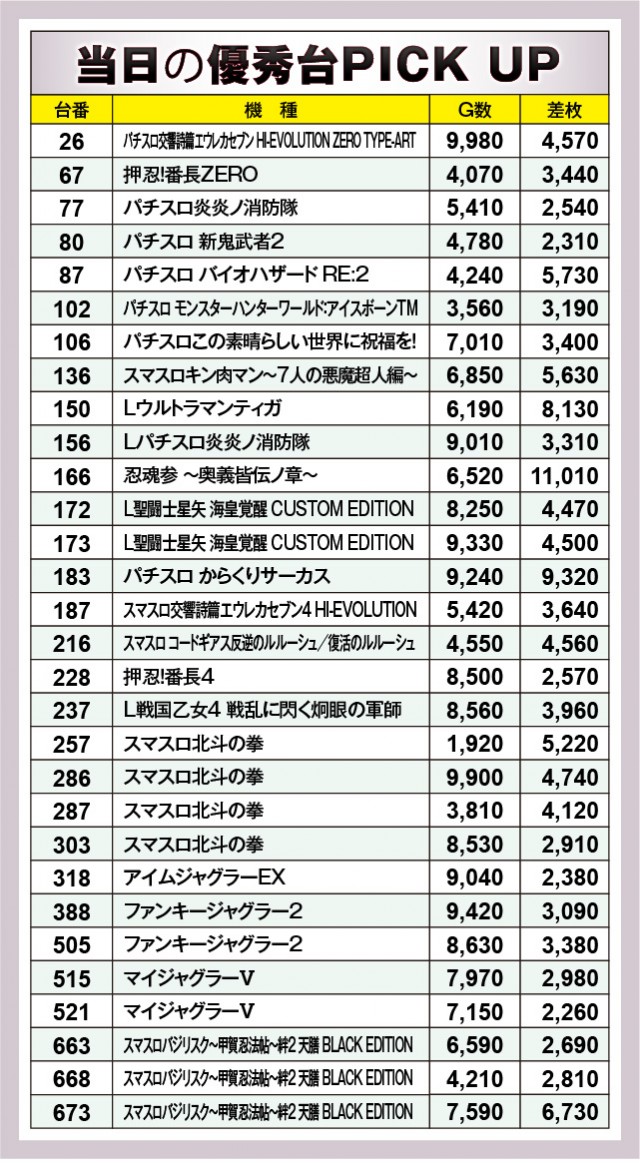 『忍魂参 ~奥義皆伝ノ章~』166番台+11,010枚と偉大な記録が生まれており、さらには『Lウルトラマンティガ』150番台+8,130枚や『パチスロ からくりサーカス』183番台+9,320枚という熱気も確認できた。これらの高い熱量が生まれた要因は、上表のゲーム数に如実に表れていると言える。終日を通して打ち込まれた台が多く、8~9千回転台をマークする台が多数発生していた事実は、ファンが手応えを感じていた証拠だ。