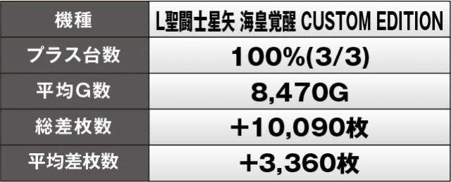 『L聖闘士星矢 海皇覚醒 CUSTOM EDITION』は全3台がプラス差枚数をマーク。さらに平均ゲーム数も8,470Gと高く、ファンは明らかに好感触を得ていたのではないだろうか。総差枚数も5桁を記録しており、活気と熱気に満ちるエリアだったのは間違いない。