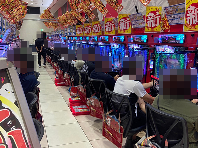 時間の経過とともにプレイヤーはさらに増えていき、低貸し玉コーナーも含めて、ホール全体が大にぎわいといった状況。