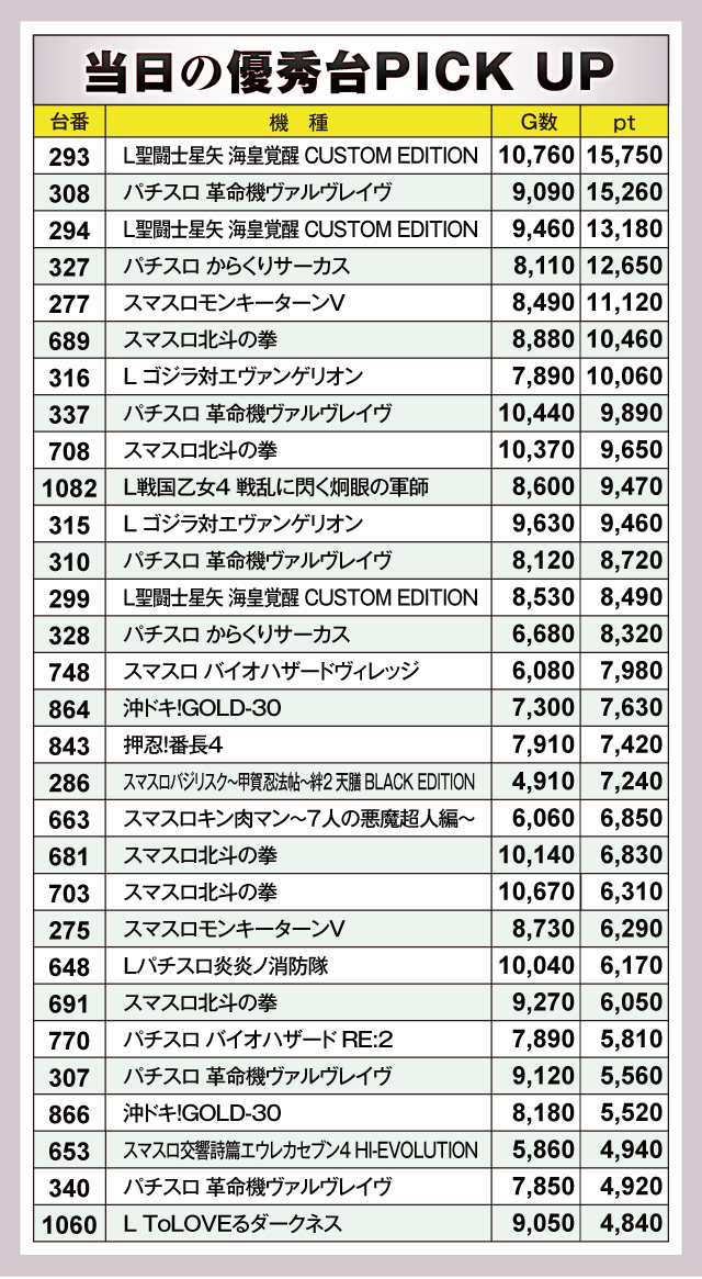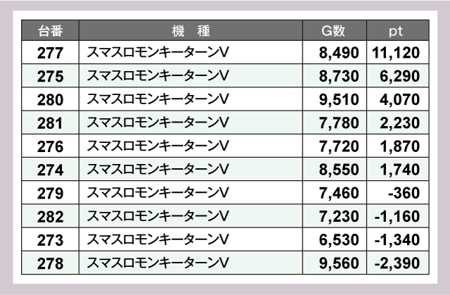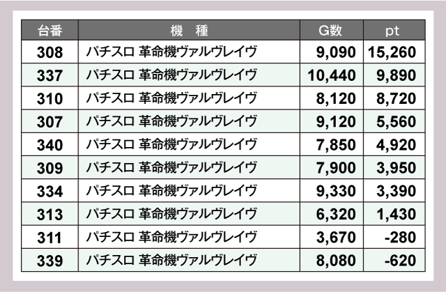 どの機種も万枚オーバーの1台だけが活躍、というわけではない。『パチスロ 革命機ヴァルヴレイヴ』は337番台が+9,890枚、『スマスロ北斗の拳』は708番台が+9,650枚、『スマスロモンキーターンV』は275番台が+6,290枚と、それぞれ理想的な展開を迎える機種も多数誕生していたのだ。