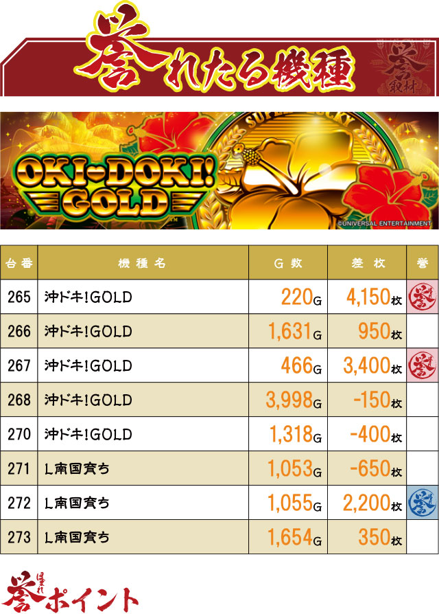 沖スロコーナーから活気がみなぎっていたこの日。特に『沖ドキ!GOLD』と『L南国育ち』コーナーからハイビスカスランプとパトランプのまばゆい光が絶えず、前者からは赤誉マーキングも出現!そんな好状況だっただけに、あまり回されていない台があったのが非常に悔やまれる…。
