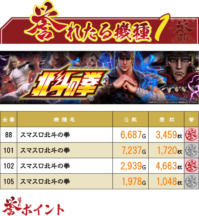『スマスロ北斗の拳』全9台の結果を集計したところ、約半数の4台に誉マーキング!しかも内2台は+3,000枚超えの赤誉マークが付いていた。この4台は優秀台と見て間違いない…!?