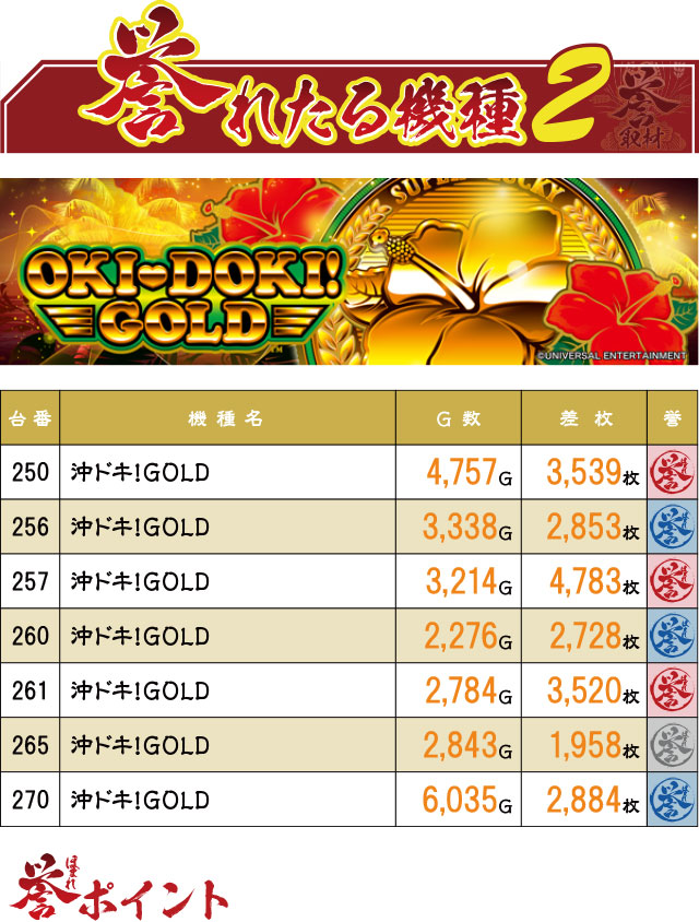 ぱちタウン取材班の予想以上に大活躍を見せていたのが『沖ドキ!GOLD』。半数近い台に誉マークが付いており、そのほとんどが赤&青誉マークとなっていた。この結果から推測するに、かなりの数の優秀台が潜んでいたのかも。