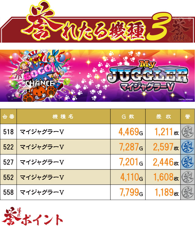 最大設置を誇る『マイジャグラーⅤ』に誉マークが多かったのも当然の話。ボーナス合算確率が良好な台を数多く目撃することとなった。