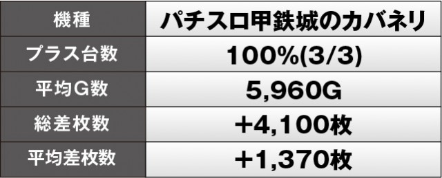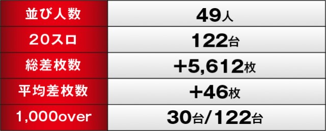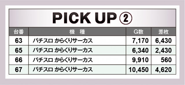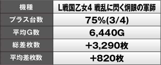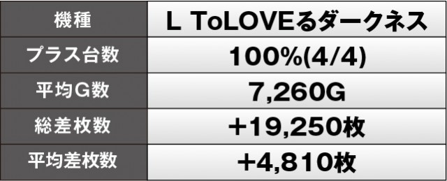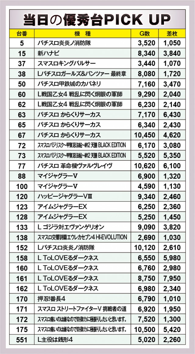 『L ToLOVEるダークネス』『パチスロ甲鉄城のカバネリ』は全台プラス差枚数を記録し、特に前者は総差枚数+19,250枚と大きな数字を築き上げた。また『パチスロ からくりサーカス』は平均ゲーム数8,250Gとなっており、閉店まで打ち込まれた形跡が見られる。平均差枚数+1,400枚という数字も印象的で、今後もこれら機種の動向から目が離せない。