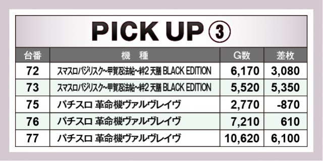 『パチスロ からくりサーカス』『スマスロバジリスク~甲賀忍法帖~絆2 天膳 BLACK EDITION』『パチスロ 革命機ヴァルヴレイヴ』は大台を突破しており、各好況スポットを盛り上げた存在となっていた。いずれも高い回転数を記録しており、ファンが大きな手応えを感じていたのは確かだろう。