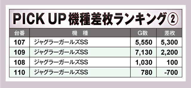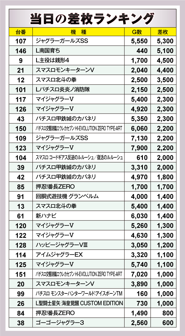 この日の差枚数ランキングを見てみると、トップに立ったのはなんと『ジャグラーガールズSS』107番台で、その記録は+5,300枚! 人気のスマスロを抑えるとは、かなりの熱量を放っていたハズ。もちろんスマスロも優秀な成績となっており、『L南国育ち』『L主役は銭形4』『スマスロモンキーターンV』といった機種から+4,000枚overの特大な記録が生まれていた。
