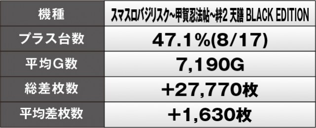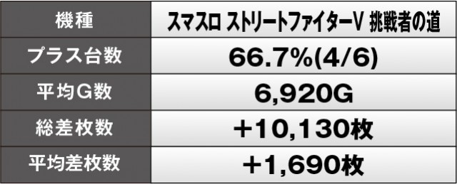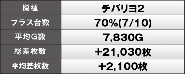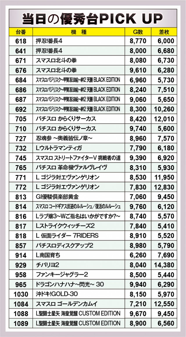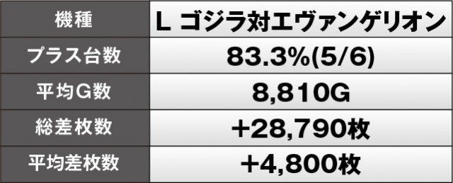 『L ゴジラ対エヴァンゲリオン』『スマスロ ストリートファイターV 挑戦者の道』『スマスロバジリスク~甲賀忍法帖~絆2 天膳 BLACK EDITION』は総差枚数2万枚OVER、『チバリヨ2』は総差枚数1万枚OVERと、優秀機種たちの活躍が大きく目立っていた。平均ゲーム数の大きさも印象的で、ファンは有意義な時間を過ごしていたのは間違いない。