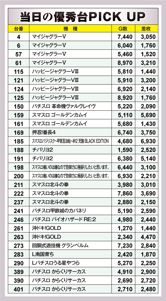 優秀台に目を通してみると、『スマスロ ゴールデンカムイ』159番台+5,690枚や『沖ドキ!GOLD』263番台+4,470枚といった盛り上がりが見られる他、『ジャグラー』シリーズが人気を博していた様子も見逃せないばかりで、各所でファンが笑顔を浮かべる光景が広がっていた。