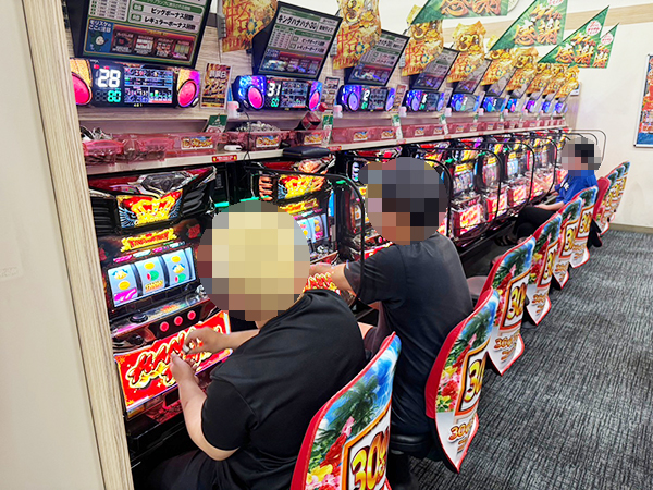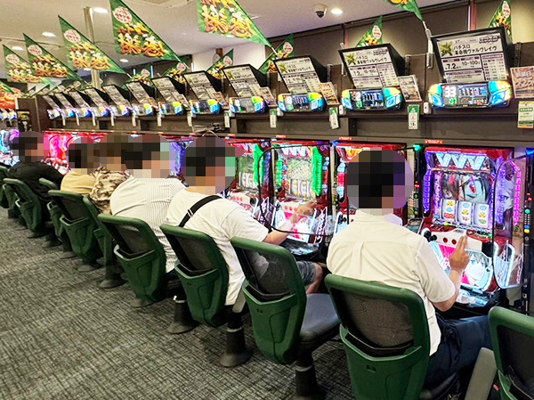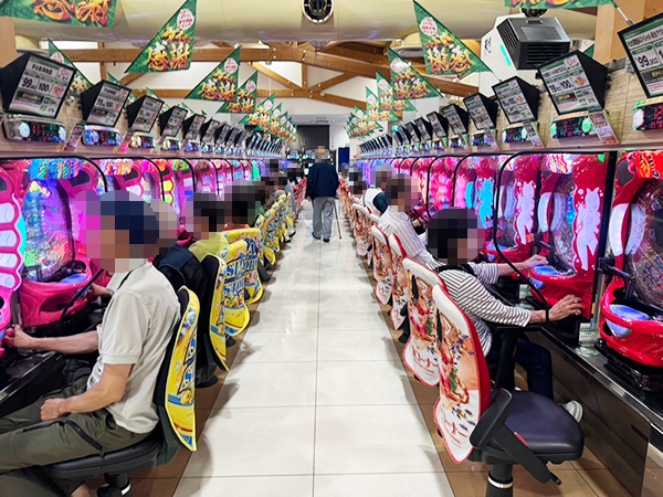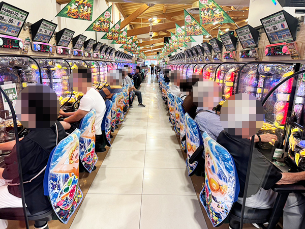 15時ごろの100円/90玉パチンコでは海物語シリーズが好評で、プレイヤーの嬉しそうな表情を多数確認している。