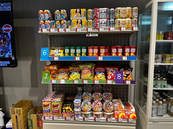 景品コーナーは豊富な品揃えで、酒類やお菓子、インスタント食品など様々なアイテムが用意されていた。