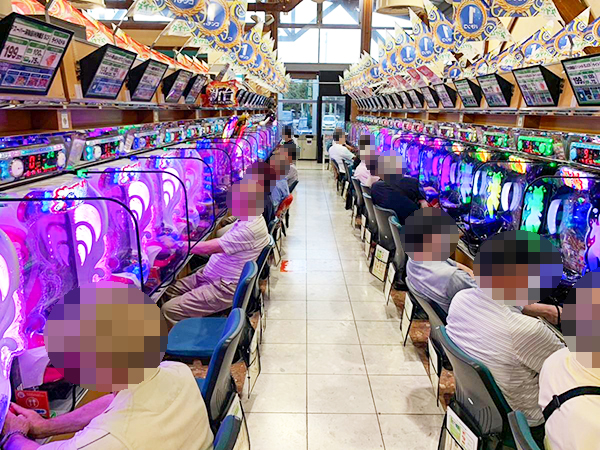 100円/89玉パチンコは海物語シリーズに人気が集まっており、ほぼ満席となるほどの盛況ぶりだった。