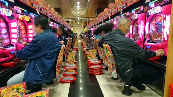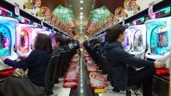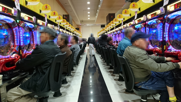 年配層を中心に、遊パチの海物語シリーズが人気を集めていた。プレイヤーの明るい表情からは充実した時間を過ごせていると思えた。