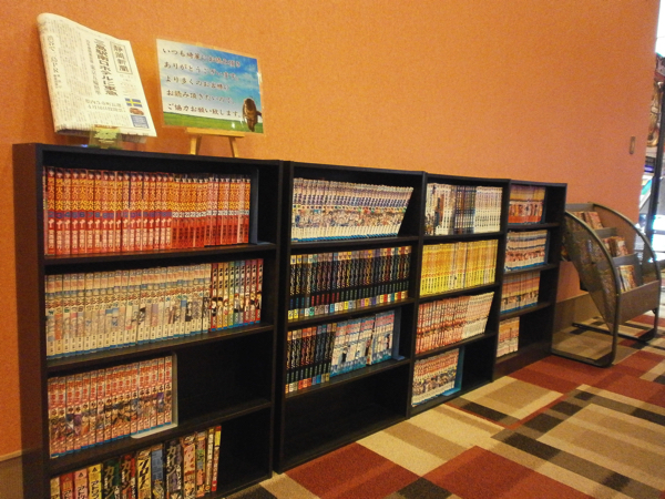 休憩コーナーには漫画本や雑誌などが豊富に取り揃えられており、ゆったりとくつろげる工夫がされていた。