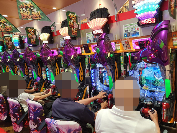 14時ごろの4円パチンコを見てみると「e花の慶次〜傾奇一転」や「新世紀エヴァンゲリオン〜未来への咆哮〜」が高稼働。プレイヤーの嬉しそうな表情を多数確認している。