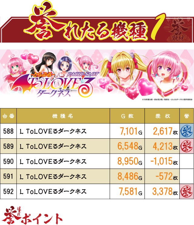 ぱちタウン取材班の目を引いたのは、5台設置の『L ToLOVEるダークネス』。5台中3台がプラっていた上、内2台が赤誉マーキング。マイナスの2台の結果もそこまで大きいマイナス値ではなかったため、もしかしたら全台系だった可能性も…!?