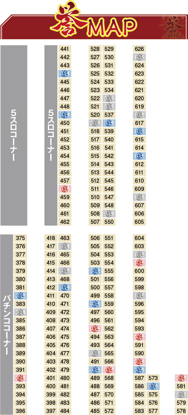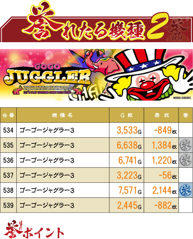 12台設置の『ゴーゴージャグラー3』コーナーでは、こちらの6台並びのブロックが大きな盛り上がりを見せていた。残念ながら赤誉マークには届かなかったが、打っていた方は手応えを感じ取っていたのではないだろうか。