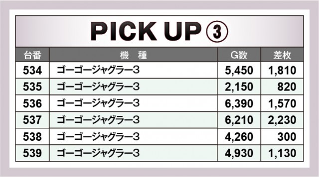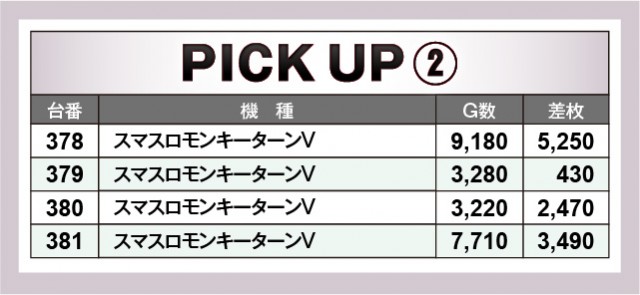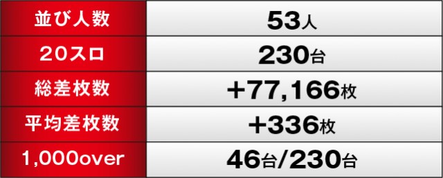 当日は3ヶ所の横並び好況スポットが存在し、その中でまとまりのある出玉を獲得する台が見られた。『スマスロモンキーターンV』378番台+5,250枚は消化されたゲーム数も相まって、右肩上がりのグラフを描いていたのが鮮烈であるばかり。また『ゴーゴージャグラー3』も同様で、こちらはGOGOランプの輝きが何よりも癒しになっていたことだろう。